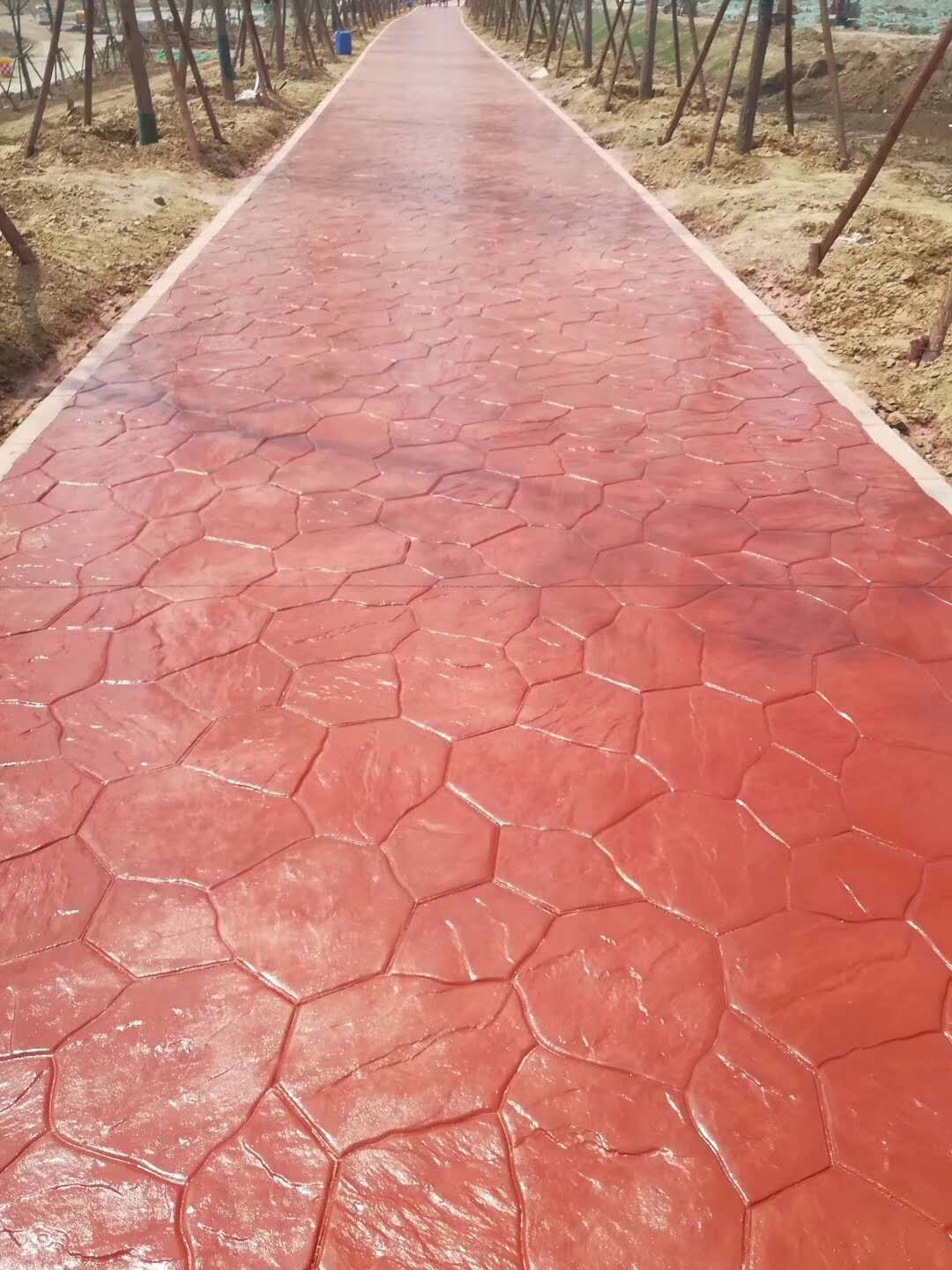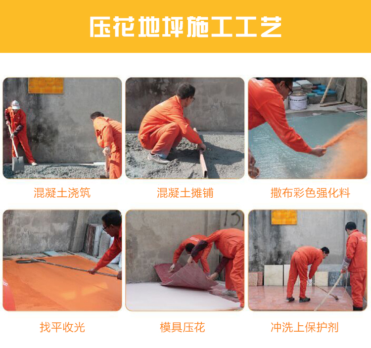 4.彩色脫模粉處理:施工的表面均勻拋撒彩色脫模粉,將整個表面覆蓋,同時在模具的表面也撒上一些脫模粉;